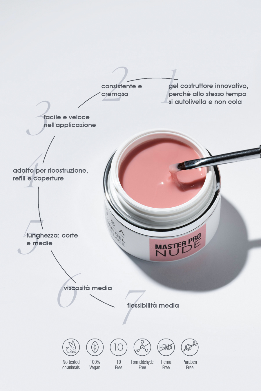 La gamme MASTER est une gamme de gels de construction de dernière génération à haute viscosité et auto-égalisant. Gels de construction à haute pigmentation qui permettent de couvrir parfaitement les imperfections de l’ongle naturel, pour un magnifique rendu naturel. Après polymérisation, les gels de construction MASTER conservent parfaitement leur courbure et conviennent aussi bien à la reconstruction des ongles naturels qu’à l’allongement du lit de l’ongle, au remplissage et au recouvrement. Longueur : courte, moyenne et moyenne-longue. Flexibilité : moyenne à élevée