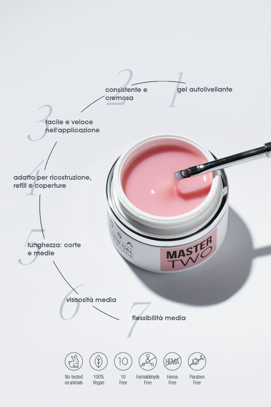 MASTER TWO Gel Builder de qualité supérieure avec auto-nivellement à haute viscosité, une caractéristique qui rend le gel rapide et facile à la fois dans l’application et dans le traitement. Il s’adapte à tout type d’ongles naturels. Avant l’application, il est recommandé d’appliquer une fine couche de Smart Base. Particulièrement adapté comme base pour la réalisation du Frech.