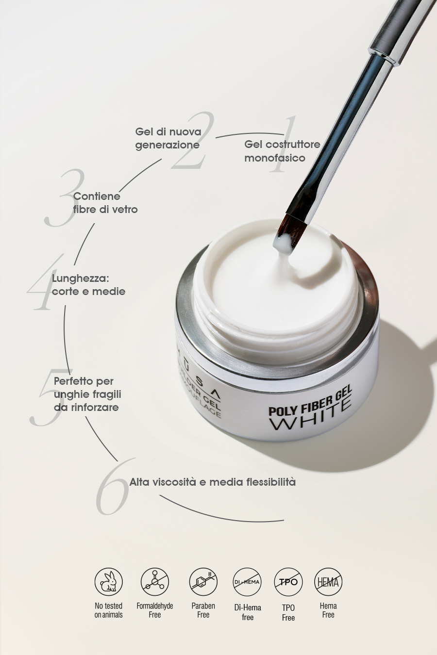 Poly Fiber Gel est un gel de construction monophasique innovant, enrichi de microfibres polymères, conçu pour renforcer, protéger et façonner même les ongles les plus fins ou les plus fragiles.